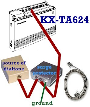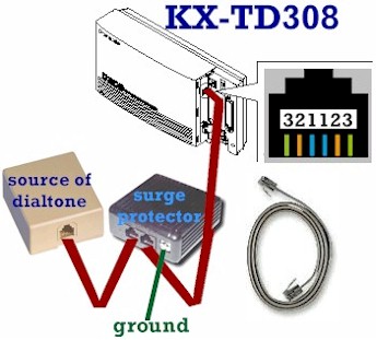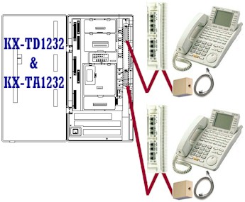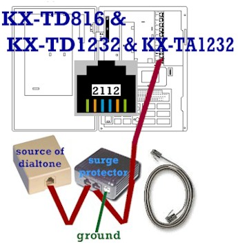 Connections are made via jacks inside the voice processor cabinet. When connected to a Panasonic KX-TD digital phone system or the KX-TA1232, one phone cord is capable of carrying two simultaneous conversations between the voice processor and phone system. This technology makes efficient use of your phone system's resources: one phone system port can handle two voice processor ports. With a Panasonic analog KX-TA624 you need one phone cord for each port in the voice processor; i.e. two cords for a KX-TVS50 in a KX-TA624. Make sure you make connections with a phone cord that has a DATA PAIR -- the yellow and black wires in a normal cord and phone jack. A cord with just two wires in the center positions will NOT work. |