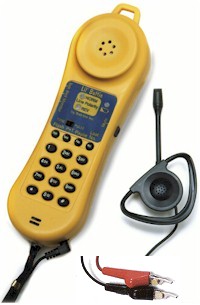 telephone test equipment -- a handset with touch-tone pad, alligator clips, and various